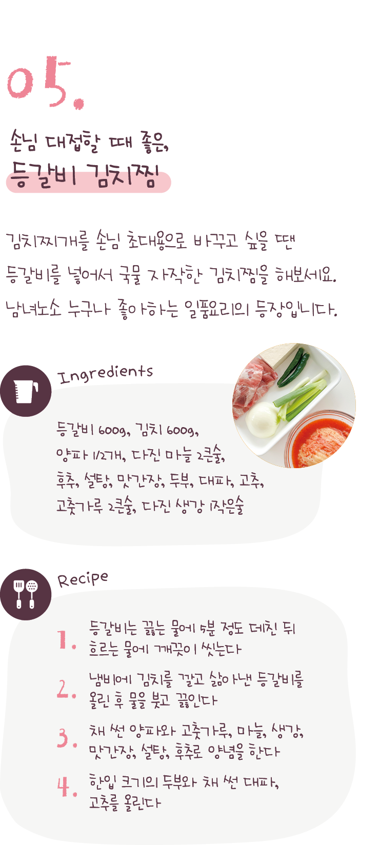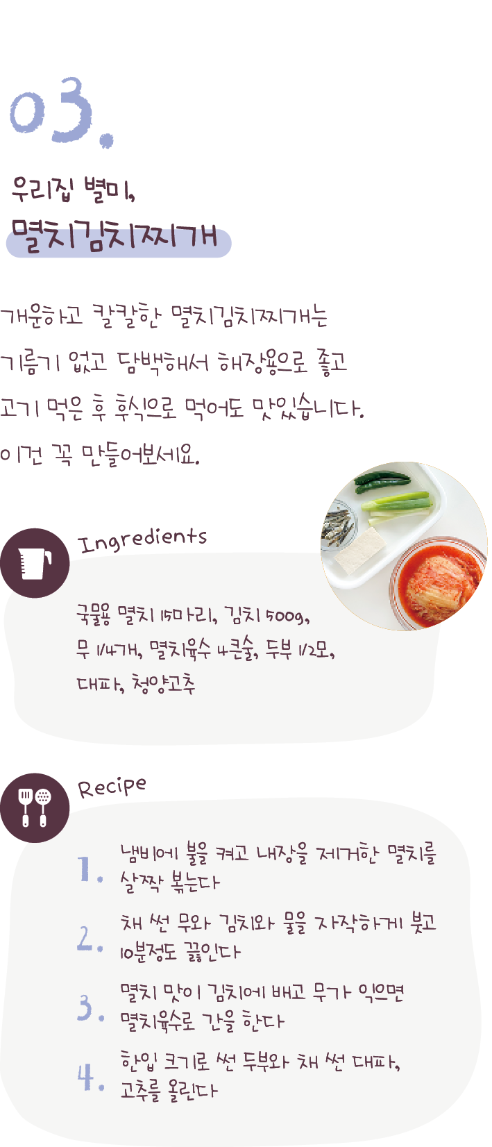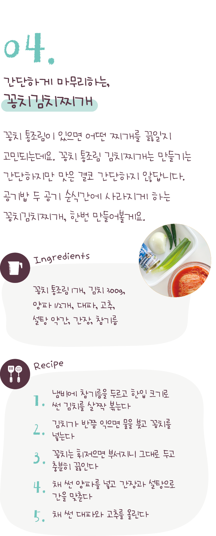 다섯 가지 김치찌개 이야기를 소개해 드리겠습니다.