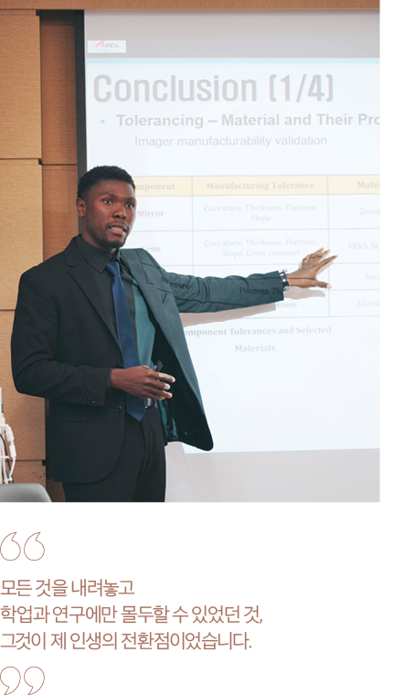 그래서 저 역시 “내가 살아 있는 동안, 인간이 다른 행성에서 정착해 사는 모습을 직접 볼 수 있을까?”라는 질문에 쉽게 답할 수 없습니다. 하지만, 지금 이 순간에도 전 세계의 수많은 과학자와 엔지니어, 그리고 저희 연구실 동료들처럼 화성 탐사와 우주 이주를 위해 연구하는 사람들이 있다는 사실이 저를 계속 꿈꾸게 만듭니다. 저의 마지막 장래와 꿈은 나이지리아에 항공우주대학을 설립하는 것입니다.