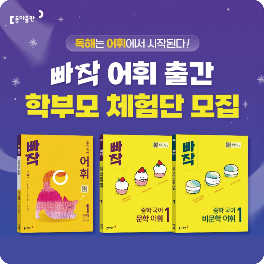 동아출판이 초등 어휘력 향상을 위한 어휘 실전서 <빠작 초등 어휘> 1~6단계를 출간했다. 빠작 초등 어휘는 초등학생이 반드시 알아야 할 비문학 어휘를 학년별로 선별해 주제별로 체계적으로 학습할 수 있도록 구성했다. ‘어휘 실력 키우기’ 코너를 통해 문장–문단–글 단위에서 어휘의 실제 쓰임을 이해하도록 돕고, 단순 암기에 그치지 않고 어휘의 배경지식과 활용 능력을 함께 키울 수 있도록 했다. 또한 중등 교과 기반의 비문학·문학 어휘서 <빠작 중학 국어 비문학 어휘>, <빠작 중학 국어 문학 어휘> 1단계도 출간을 완료했다. 2022 개정 10종 국어 교과서의 지문과 작품을 분석해 비문학·문학 어휘를 체계적으로 학습할 수 있도록 구성했으며, 2·3단계는 순차적으로 출간될 예정이다. 네이버 카페 ‘동아맘’에서는 학부모 체험단 200명 모집, 초등 어휘 학습단 100명 모집 등 다양한 이벤트가 진행되어 높은 호응을 얻었다.